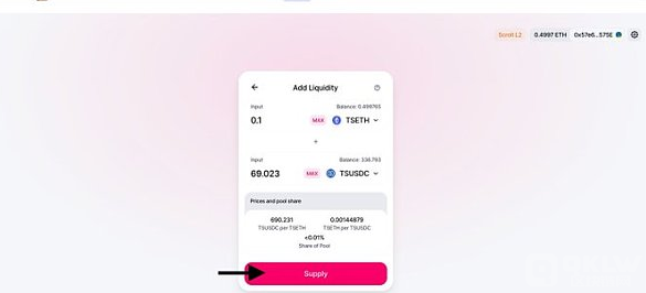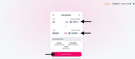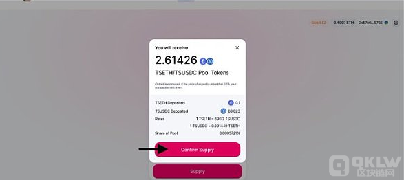 让我们添加流动性,切换到池并单击添加流动性,将代币分别设置为 TSETH 和 TSUSDC,设置数量并单击批准 TSUSDC 并在 MetaMask 中确认,然后单击“supply”,随后在 MetaMask 中单击确认供应并批准交易。