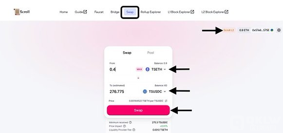 Scroll L2 测试网收到代币之后,在 MetaMask 中将 Scroll L1 测试网切换到 Scroll L2 测试网,然后将“From”设置为 TSETH,“To”设置为 TUSDC,现在设置要 Swap 的金额并单击 Swap,然后确认 Swap 并在 MetaMask 中确认交易。