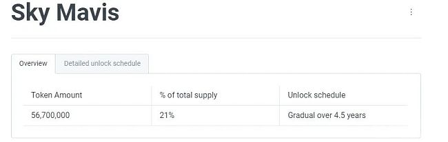 Sky Mavis代币分配的19%在代币发布当天解锁。因此,总代币供应的4%被股权实体解锁。我们不知道这些代币是否由Sky Mavis持有,还是分发给团队成员或股权投资者(他们可能已经套现)。