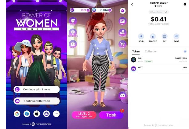 从产品的流畅度、用户体验、游戏玩法等方面来看,通过集成 Particle 服务,《Power of Women: Genesis》的用户无需了解钱包、助记词、私钥,可以直接在产品内完成签名、链上转账及 Swap 等一系列 Web3 操作,还保留了 Web2 产品时代的使用习惯和产品体验。