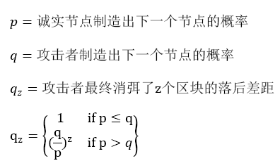 攻击者成功填补某一既定差距的可能性,可以近似地看做赌徒破产问题(Gambler’s Ruin problem)。假定一个赌徒拥有无限的透支信用,然后开始进行潜在次数为无穷的**,试图填补上自己的亏空。那么我们可以计算他填补上亏空的概率,也就是该攻击者赶上诚实链条,如下所示: