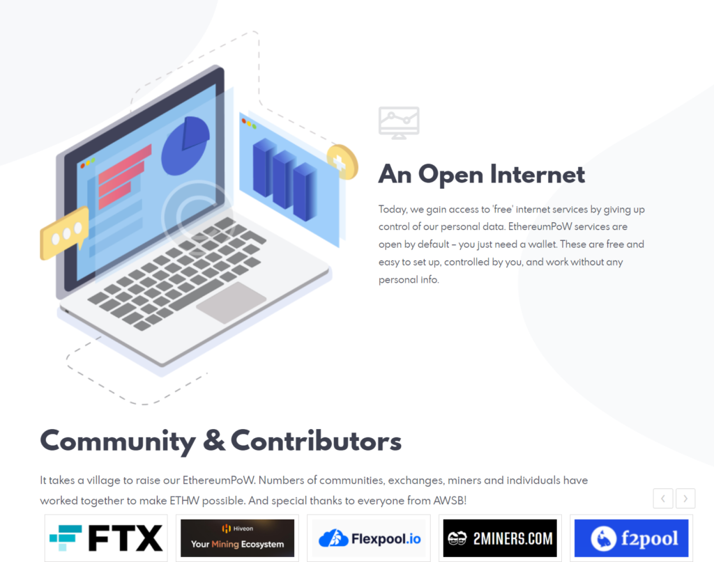 但事实上,现今许多交易所,如币安、FTX都明确表明支持POS,部分矿池如Bitfly也明确表达不会支持POW分叉,疑似ETHW单方面自行先列出支持者与合作方;现今ETHW官网已将该区贡献者/支持者区块拿掉。