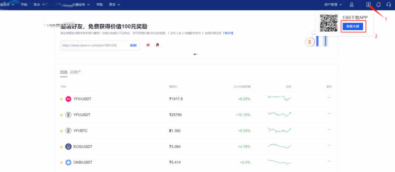 1. 市场上有很多比特币交易软件。您可以自由选择正式的交换。下面小编以OKEX交易所(https://www.ouyi.cc/)为例,打开欧易OKEx官网,点击右上角Angular下载按钮,点击查看全部。