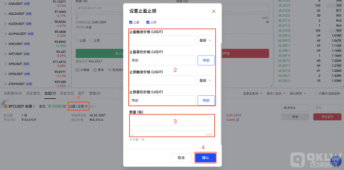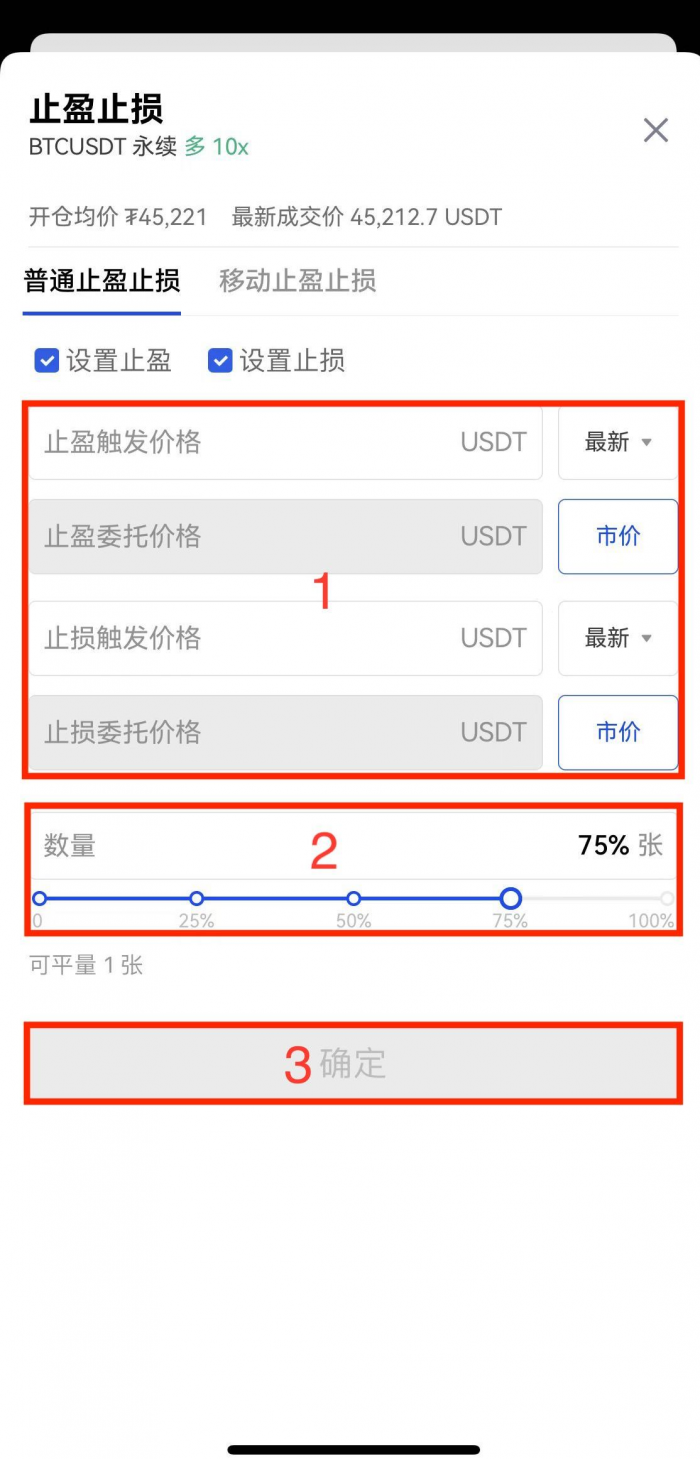 点击【仓位】—选择具体要平的仓位点击【止盈止损】—输入【止盈触发价格】、【止损触发价格】、数量—点击【确认】。