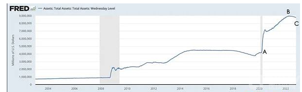 美联储的主要任务包括控制通胀和保证就业,为缓解疫情对经济和就业的冲击,美联储在20年3月开启了量化宽松的印钞模式,水龙头进水的阀门打开,注入巨量的水源推升了水位,资产价格的飙升带来了包括美股、数字货币等全球金融市场的牛市,商品价格的水涨船高也带来了高通货膨胀率。在下图A—B点,美联储总资产规模持续攀升,BTC也迎来了3800-69000美元的牛市。
