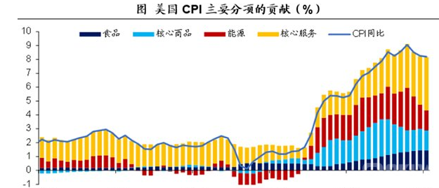 美国CPI的构成分为能源、食品、核心商品和服务几大项:能源方面,布油已从年初的120美元降至89美元;食品及商品方面,主要粮食产品的大宗价格正在走低、阻塞的供应链逐渐恢复,进口指数和家庭支出增速预期也都大幅降低。剖析目前美国通胀持续高烧不退的原因,房租和服务项是美国核心通胀上行的主要驱动力。