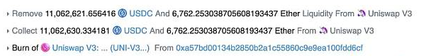 第三笔交易又是“MEV Bot”,从 USDC-WETH 池中移除了 2200 万美元的流动性。