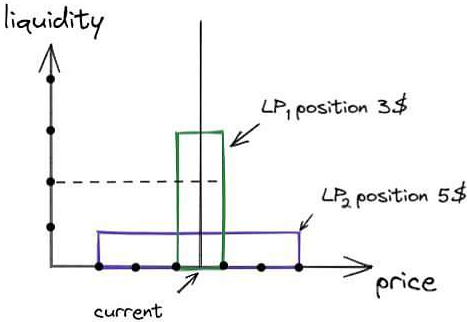 在此示例中,两个流动性提供者(LP1 和 LP2)拥有头寸。LP1 的头寸窄幅为 3 美元。LP2 拥有 5 美元的宽头寸。在这种情况下,如果价格没有超出 LP1 的持仓范围,他将获得比 LP2 多 3 倍的费用。因为 LP2 在这个范围内只有 1 美元,而这 1 美元正在与 LP1 的 3 美元竞争。