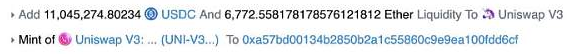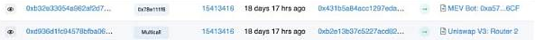 我们有三笔交易,都在区块15413416,位置 3-5,以自下而上的顺序执行。第一个使用 Execute 方法的交易是一个名为“MEV Bot”的合约,为 USDC-WETH 池增加了 2200 万美元的流动性。