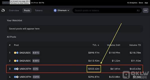 Uniswap v3 上第三个池子的 TVL 高达 3.33 亿美元(基于撰写本文时的 Uniswap 官方图表),每日交易量为 6100 万美元。