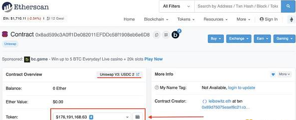 但我计算出来的是1.76 亿美元,和Uniswap v3 的官方数据并不一致,于是我决定到ETH的区块浏览器上进一步验证。理论上,每个 Uniswap v3 池子都是一个智能合约。因此,区块链浏览器可以显示池中拥有的代币余额,也就是这个池子的 TVL。