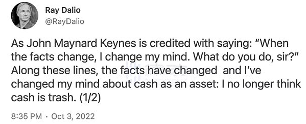 crypto 行业,在 UST 崩溃和流动性全面枯竭之后,目前正在经历自我反省和收拾残局的阶段。美元正在摧毁所有人,加之市场可以完全规避风险。现金的地位从垃圾变成了王者,正如桥水基金创始人瑞·达利欧所说:「我改变了关于现金作为一种资产的看法,我不认为现金是垃圾。」