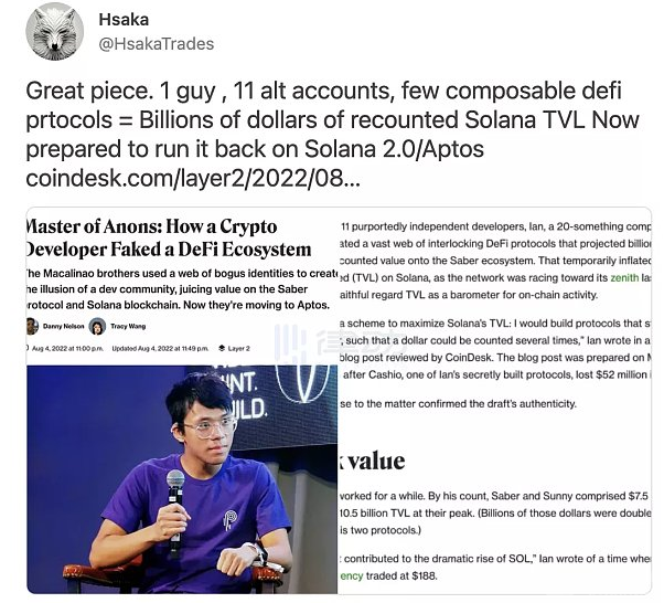 在 Solana 巅峰时期,由于其吹捧的 TVL 高得离谱,带动其情绪高涨到了极点。一个协议的 TVL 超百亿美元,无疑是在超越以太坊的路上!?几周前,我们发现高得离谱的「TVL」实际上只是被一些人循环利用了多次。