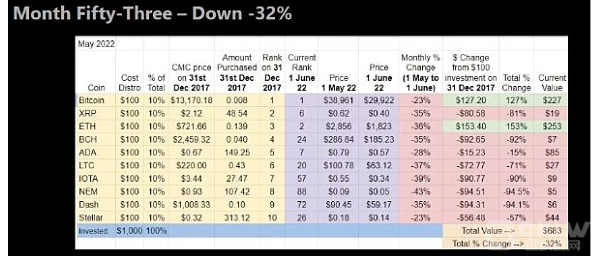 但 Greene 警告说,尽管该实验的累积表现良好,但重要的是要警惕严重的回撤:“以今年为例:现在前十名中有四个稳定币。这有点无聊,所以我不得不稍微移动一下,”他说,并补充道,“但我可能应该坚持我最了解的事情。今年我也尝试在 DeFi 上获得奖金。从 USD Coin 开始是 130 美元,我把它换成 TerraUSD,只是为了好玩,然后我把它送到了 LUNA 上,它崩溃得很厉害。”