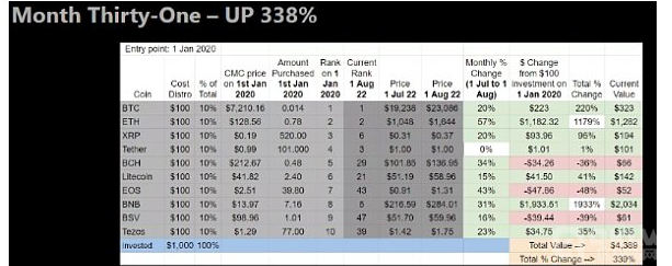 规则:在 2018 年 1 月 1 日、2019 年、2020 年和 2021 年,分别购买 100 美元的前 10 种加密货币。仅持有。不卖。没有交易。每月报告。