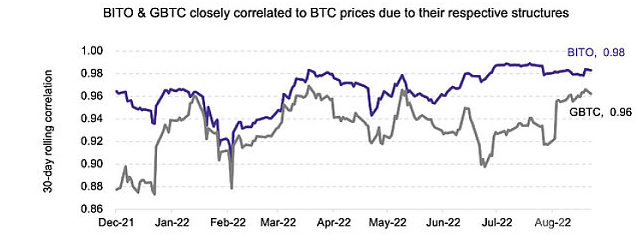 自 2022 年初至今,ProShares Bitcoin Strategy ETF (BITO) 已下跌超过 55.3%,而同期现货比特币价格的下跌幅度则为 54.4%(差异是由于未来合同的滚动成本造成,随着时间的推移会产生很小的拖累)。