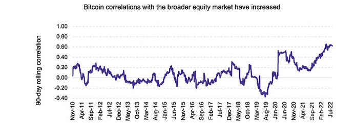 第一,在市场波动和市场走向不确定的时候,看似不相关的资产类别反而会表现出较高的相关性。实际上,除了比特币之外,即使是与美股呈负相关的债券市场,在整个 2022 年期间也呈现出与美股越来越高的正相关性。