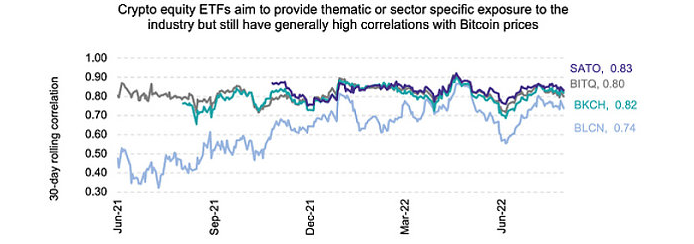 1、一些持有纯加密美股的 ETF,比如 Bitwise Crypto Industry Innovators ETF (BITQ) 和 Global X Blockchain ETF (BKCH),与比特币的相关度系数接近 0.80;