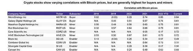 2、加密矿企也与比特币有很高的相关性,因为他们的大部分利润是根据开采的比特币价格获得的,但可能会根据他们管理电力成本和管理费用的程度而有所不同。