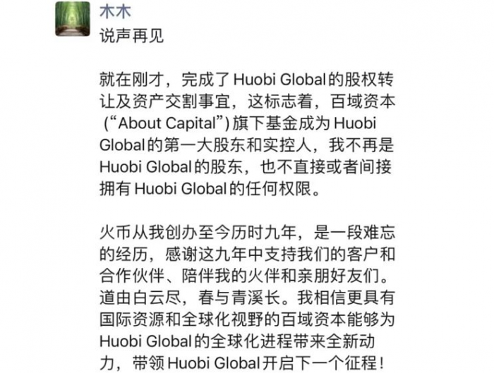 区块链网QKLW.COM记者报道:10月8日,火币创始人李林在朋友圈表示,已经将旗下股权转让与香港百域资本(About Capital),至此香港百域资本成为第一大股东和是实控人。