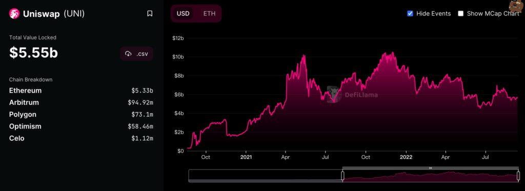 不过身为当前以太坊上更大的DEX,UniSwap的一举一动确实都备受市场关注。据Defillama数据,当前该项目的锁仓量约为55.5亿美元,虽然较去年11月的高点已失血约45%,但在众多DApp项目中仍保持相对稳健;8月初旬,Uniswap的单周收入更是一度超越以太坊,创下惊人的历史。
