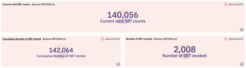 本站讯:交易所币安(Binance)在上周四(8日)正式推出,基于BNB链建造的灵魂绑定代币「BAB,Binance Account Bound」。所有已完成币安KYC认证的用户皆可领取。据Dune Analytics数据,BAB当前已累计铸造142,064枚,其中2,008枚已撤销,实际有效铸造为140,056枚。