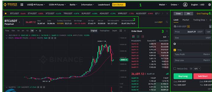 1. 菜单栏区域列出了访问其他币安页面的链接(例如币本位合约、合约对战、排行榜及现货页面)。“合约信息”下拉栏里可查看币安合约常见问题、资金费率、指数价格和其他市场交易数据等。