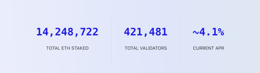 根据以太坊基金会官网数据,信标链当前的总质押量已突破1,400万枚ETH(现价约230亿美元),验证者总数量来到约42.1万个、质押奖励率则为4.1%。