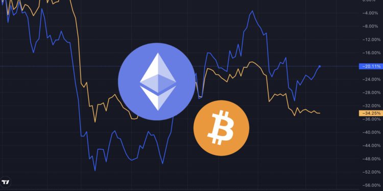 蓝线:以太坊、橘线:比特币