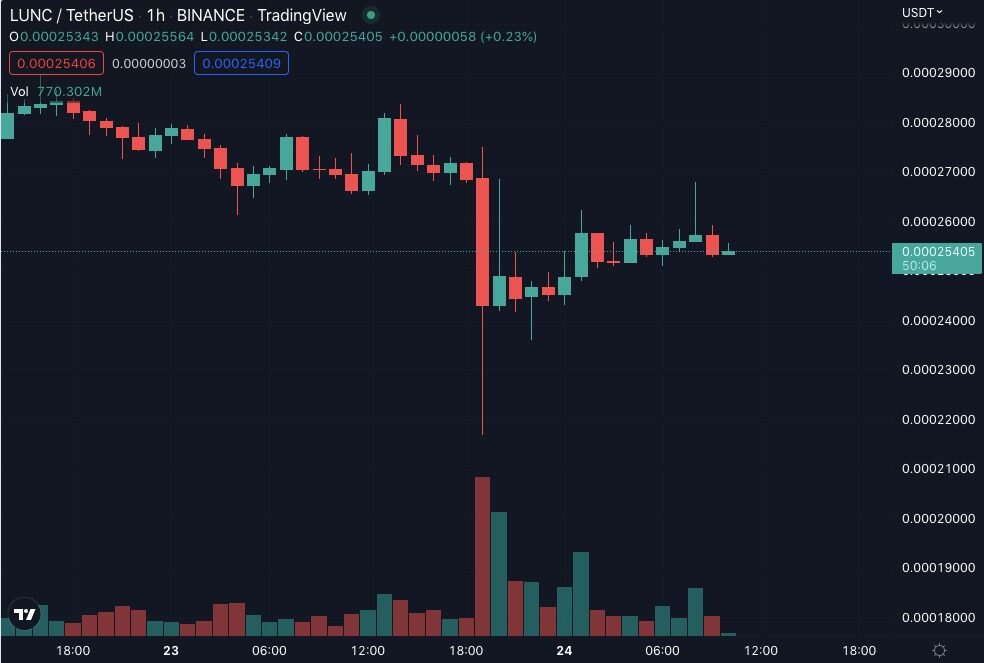 在CZ发表不支持对链下交易征收1.2%燃烧税的言论后,LUNC价格在昨晚一小时内闪跌近10%,截稿前报0.00025美元,近24小时跌幅达6.1%。