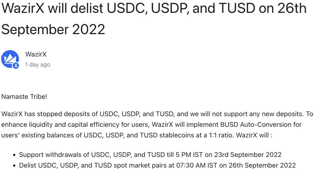 而与币安有业务来往的印度加密交易所WazirX在9/19也跟着发布类似公告,不同的是WazirX在9/26时会直接下架USDC、USDP与TUSD并停止支持,用户此前持有的上述三种稳定币会自动转换为BUSD,官方也不再支援三种稳定币的入金。