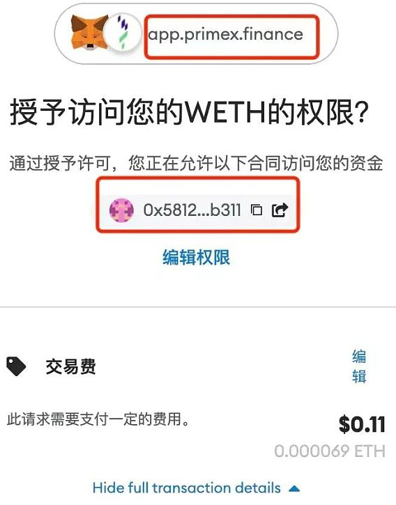 授权ERC20代币时同样需要观察交易详情,下图给出了授权https://app.primex.finance使用用户持有的WETH的交易请求,一定要确保这个https开头的站点域名用户是相信的,而如果在钓鱼站点弹出的权限请求字段会是这样“钓鱼站点域名 可以访问并使用此最大数额”,如果发现其中域名你无法相信时,一定要拒绝交易。必要时还可点击“您正在允许以下合同访问您的资金”中的合约(红框圈出了),去区块链浏览器查询下目标地址的行为及操作,如果有恶意行为(例如频繁转移用户资产)就拒绝,如果是私人地址而不是合约地址一定要拒绝。
