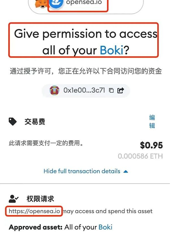 授权NFT操作时仔细观察一下Metamask弹出的交易详情,下图给出了用户在希望卖出Boki NFT 的时候,需要授权opensea合约的操作,重点需要关注权限请求字段“http://opensea.io may access and spend this asset”,一定要确保这个https开头的站点域名用户是相信的,而如果在钓鱼站点弹出的权限请求字段会是这样“钓鱼站点域名 may access and spend this asset”,如果发现其中域名你无法相信时,一定要拒绝交易。必要时还可点击“您正在允许以下合同访问您的资金”中的合约,去区块链浏览器查询下目标地址的行为及操作,如果有恶意行为(例如频繁转移用户资产)就拒绝,如果是私人地址而不是合约地址一定要拒绝。