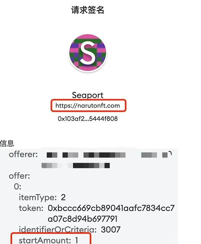 SeaPort为Opensea官方交易所使用的智能合约,但发起签名请求的narotunft.com为攻击者钓鱼站点:钓鱼站点提供的待签名数据对攻击者有益,通过将签名数据中的售卖价格设置为1(单位不是1ETH而是1ether,相当于几乎不花钱就可以买走用户挂单的NFT),诱导用户签署(签署后,对应的NFT将以低价挂售)最终获利。用户在实施签名操作时没有对待签名数据来源(钓鱼站点)及数据内容合法性进行认证是攻击成功实施的重要原因。