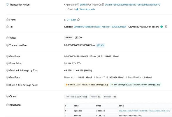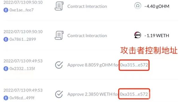 下图为受害者账户授权gOHM代币给攻击者账户的交易记录: