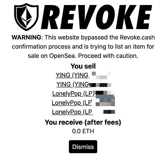 安装revoke.cash,在钓鱼站点发起不安全挂单请求时,会提示用户注意。可以看到由于实验账户中的boki没有授权给Opensea,所以不会出现在告警提醒中。