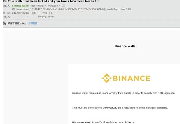 下图给出了一封以盗取区块链数字资产为目标的钓鱼邮件:用户需要在特定截止日期(DDL)前在平台处登记区块链钱包,不然就冻结(威胁)账户。在收到这类电子邮件时,不点击邮件或私信中包含的任何超链接信息或按钮,待与官方核实确认邮件内容合法性后,再对邮件进行处理。