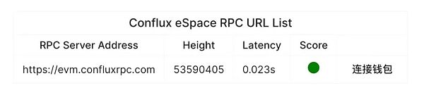 下图给出了 Conflux eSpace 区块链网络对外公开的 RPC 节点信息,通过钱包连接RPC节点,在用户发起转账和智能合约交互时,由RPC代理将交易打包发送至区块链网络,最终使交易以区块形式进上链。