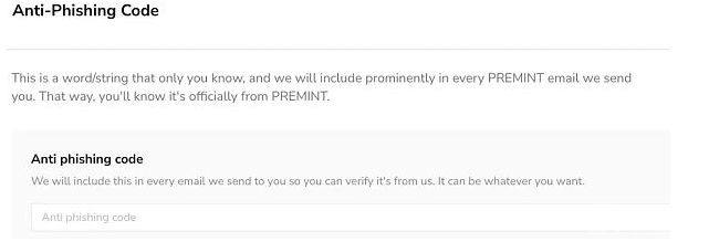 设置防钓鱼码能够在一定程度解决钓鱼邮件的问题,下图给出了premint平台提供的防钓鱼码功能: