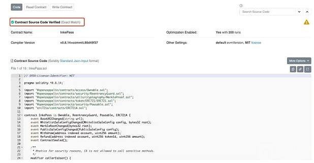 区块链浏览器还提供了智能合约开源展示的功能,便于用户在与智能合约交互前对代码安全性进行审查。用户应当掌握检查智能合约是否已处于开源验证状态的方法。用户应当优先选择与已完成智能合约代码开源验证的处理的智能合约进行交互。用户应通过区块链浏览器,对智能合约代码安全性进行审计,在确保代码不存在权限滥用或恶意使用用户数字资产的行为后,再与合约进行交互。已完成智能合约代码开源验证处理的智能合约在区块链浏览器中的展示信息如下所示: