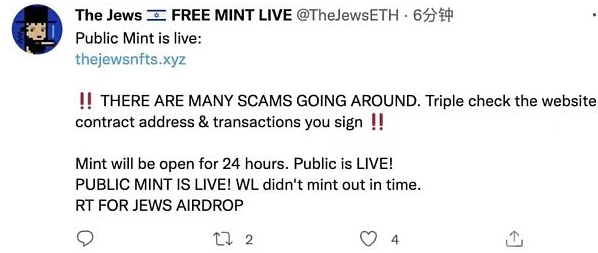 相似的推特用户名:为了以假乱真,攻击者还专门按照正版账户的推特用户名设置规则进行了仿冒,仿冒账户为@TheJewsETH,正版账户为@TheJewsNFT;