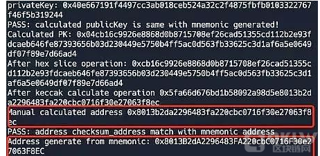 区块链钱包软件所管理的私钥通常是256bit长的随机字符串,为便于展示区块链钱包工具会将256bit数据转换为32字节长的16进制编码。“0x40e667191f4497cc3ab018ceb524a32c2f4875fbfb0103322767f46f5b319244”即为区块链钱包软件生成的钱包私钥。通过将私钥导入区块链钱包,用户即可掌握钱包内对应的数字资产。利用椭圆曲线密码框架,开发者可以利用私钥数据便捷的计算出与之对应的公钥信息,通过对公钥进行keccak256运算[7]并取运算结果的最后20字节,即获得区块链钱包地址。使用以太坊ethers工具库生成公私钥,并根据公钥信息计算钱包地址的代码运行结果如下图所示: