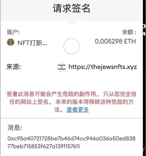 下图给出了一个不安全的待签名请求,发起该请求的站点为钓鱼站点 https://thejewsnfts.xyz,在后文我们还将对其通过仿冒推特账户实施攻击的方法进行阐述。