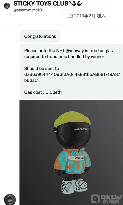 用户参与某抽奖活动并中奖,奖品是免费向用户赠送的,但用户需要向特定钱包转账0.02ETH作为gas费,对方再将中奖奖品转发给中奖用户。