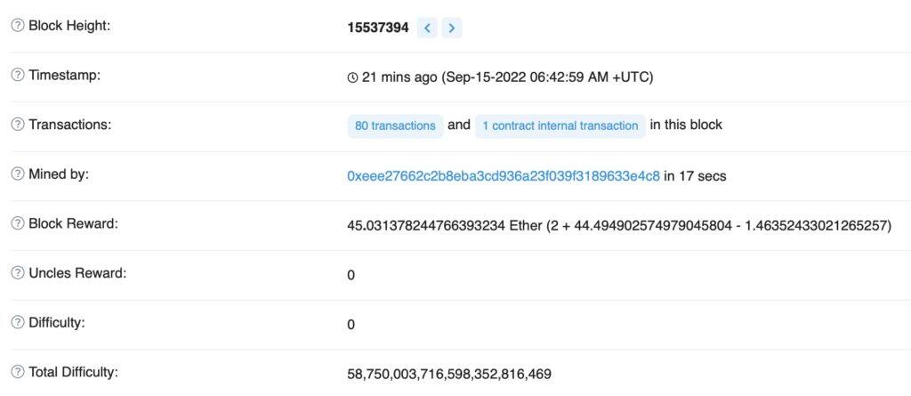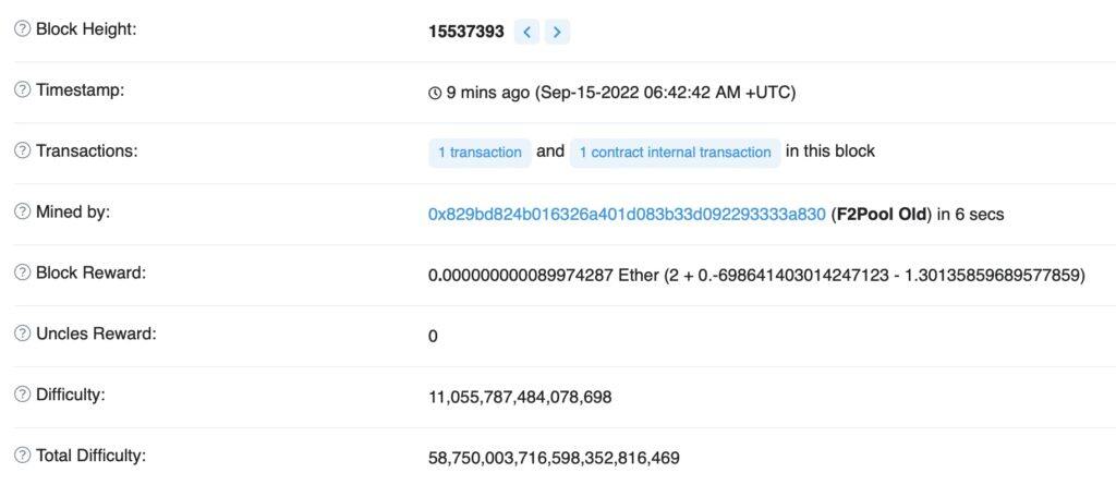 据Etherscan数据显示,以太坊PoW时代最后一个区块由中国更大矿池F2Pool所挖出,高度为15537393。几秒钟之后,象征着PoS时代到来的首个区块,高度为15537394正式诞生,打包验证人地址为:0xeee27662c2b8eba3cd936a23f039f3189633e4c8。