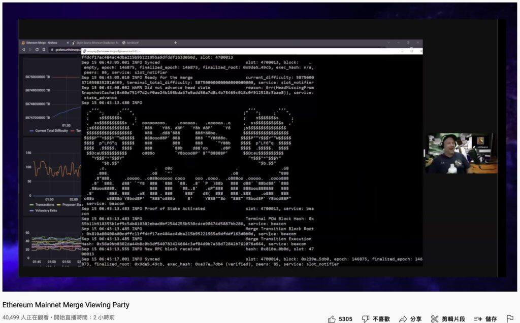 币圈子(120 *** C.COM)讯:备受瞩目的以太坊合并(The Merge)就在今(15)日下午14:42左右,当主网工作证明难度(TTD)突破58,750,000,000T之后触发,正式从工作量证明机制(PoW)转向权益证明机制(PoS),完成执行层与共识层的合并。当时在以太坊基金会举办的线上直播中,开发团队兴奋的发出「POS Activated」的图片,并有超过4万人一同见证这个历史。
