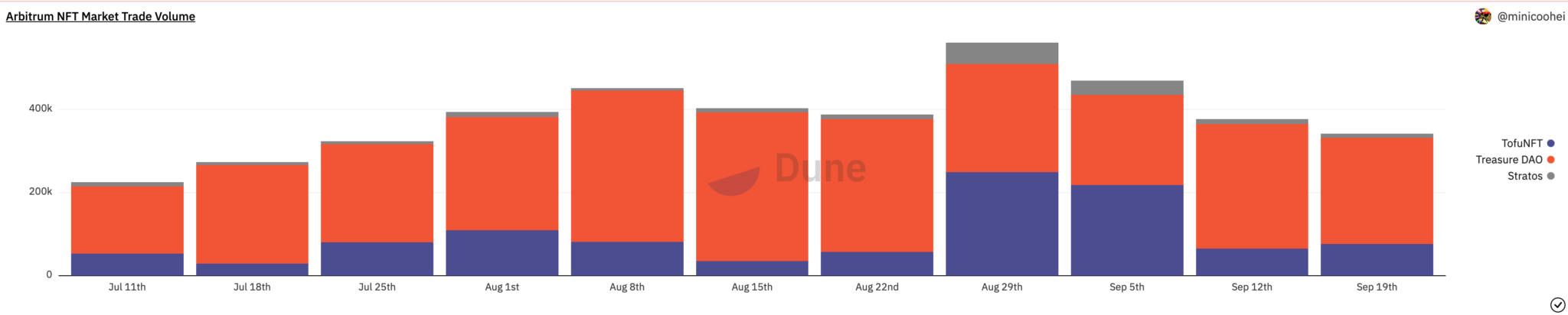 根据Dune Analytics的数据显示,Arbitrum现有的NFT交易市场包含TofuNFT、TreasureDao和Stratos,其中又以TreasureDao的交易量为更大,该市场以Treasure的原生代币MAGIC作为计价。
