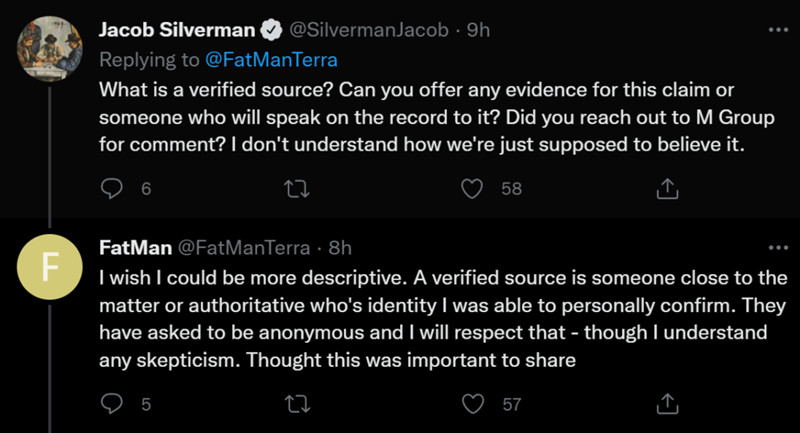 贴文一出后,立即引发社群哗然,其中 *** 记者Silverman Jacob质疑FatMan未经查证,然而FatMan回应称该消息源已经经过查证,并且与爆料人士接触确认身分,但相关人士要求匿名,FatMan表明在经过核实后,仍认为这是重要且需要分享的事情。