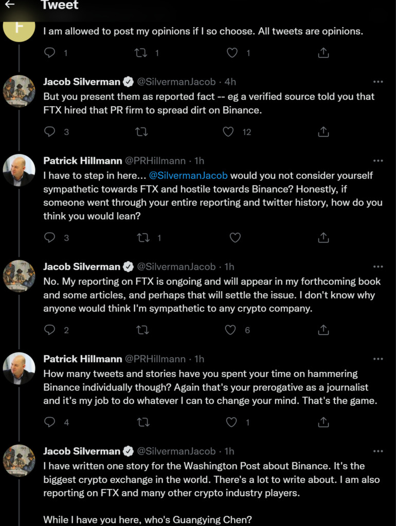 有趣的是,该贴文还引来币安CCO Patrick Hillmann的回应,Hillmann在该贴文对质疑FatMan报导不实的记者Jacob展开了反质疑,声称Jacob过去的报导对FTX富有同情心,而对币安具有敌意。