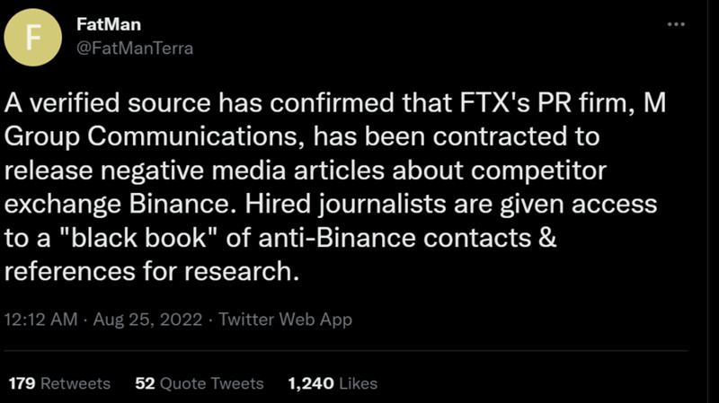 本站讯:Terra前研究员FatMan今(25)日凌晨于推特上爆料,声称交易所FTX聘用公关公司M GroupCommunications对币安进行负面宣传,FatMan声称该公司提供许多雇用的记者币安的黑料与相关反对币安的联络人进行研究。